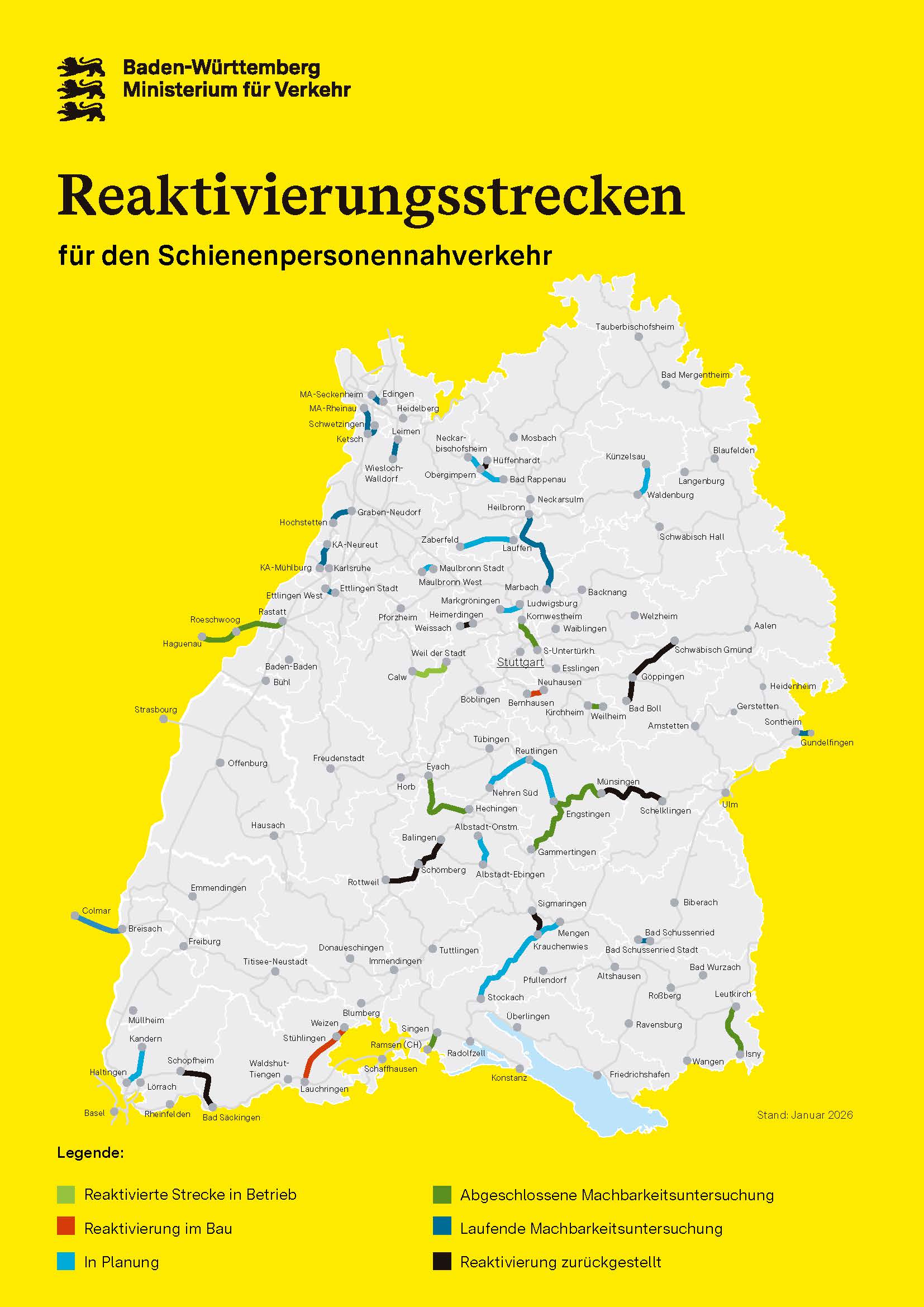 Für insgesamt 21 stillgelegte Bahnstrecken werden derzeit landesgeförderte Machbarkeitsstudien durchgeführt oder sind bereits beendet (Stand Juli 2025).