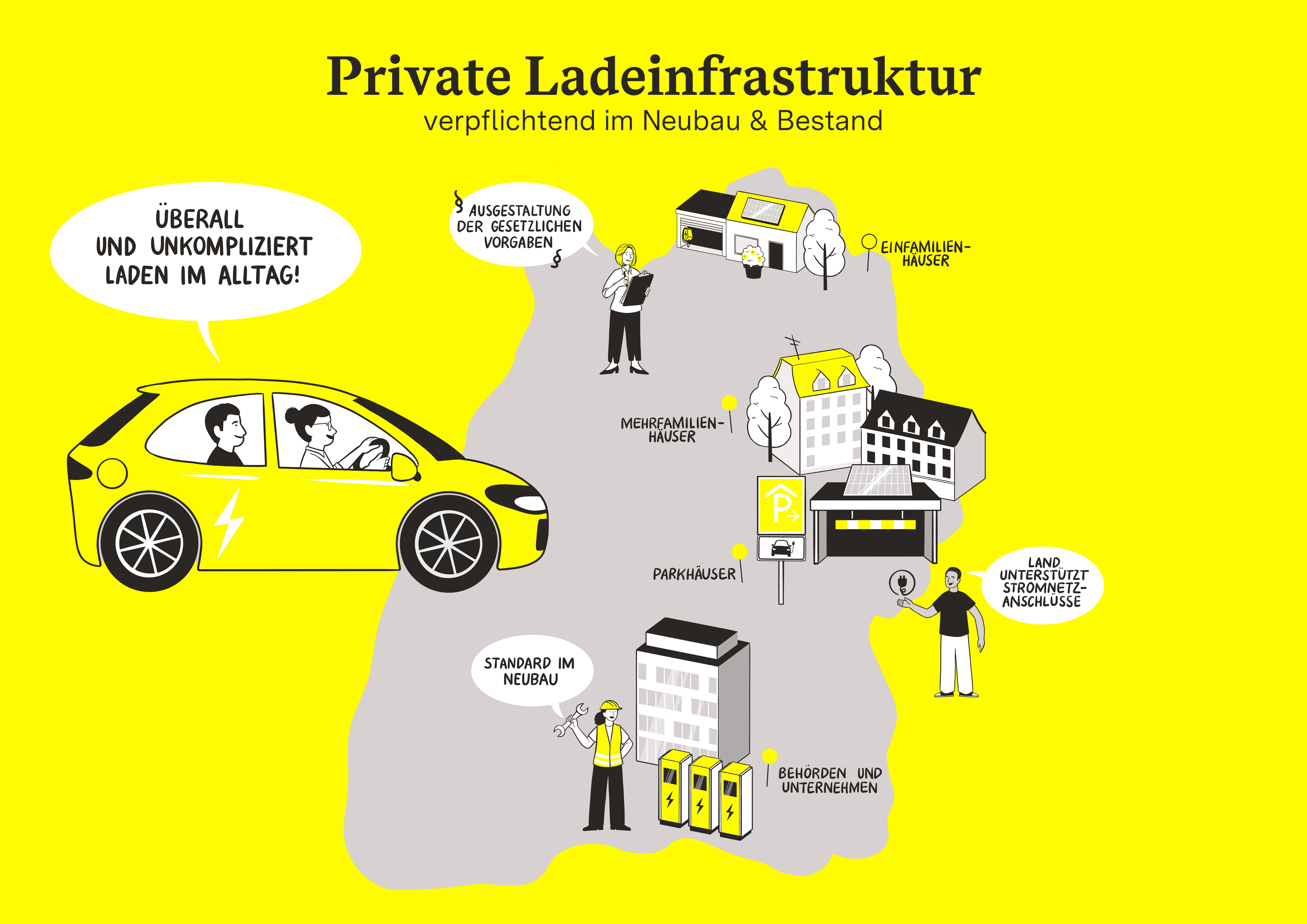 Bis 2030 werden insgesamt circa zwei Millionen öffentlich zugängliche und private Ladepunkte entstehen. Dazu müssen gesetzliche Vorgaben an neuen und bestehenden Wohn- und Gewerbegebäuden umgesetzt werden. Anträge und Genehmigungen für den Aufbau von Ladeinfrastrukturen werden vereinfacht.